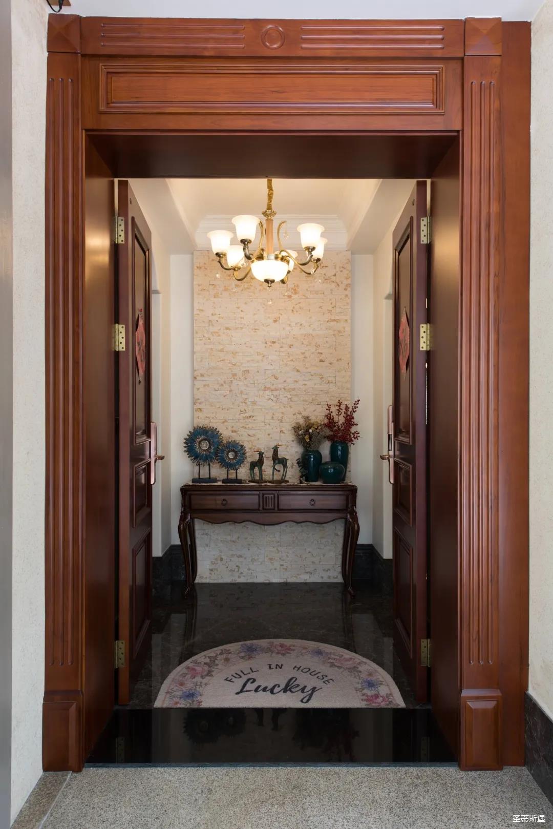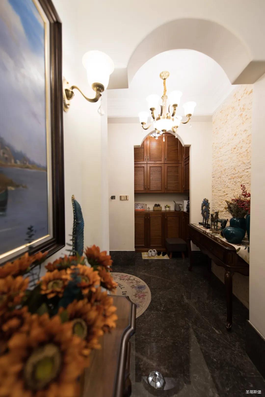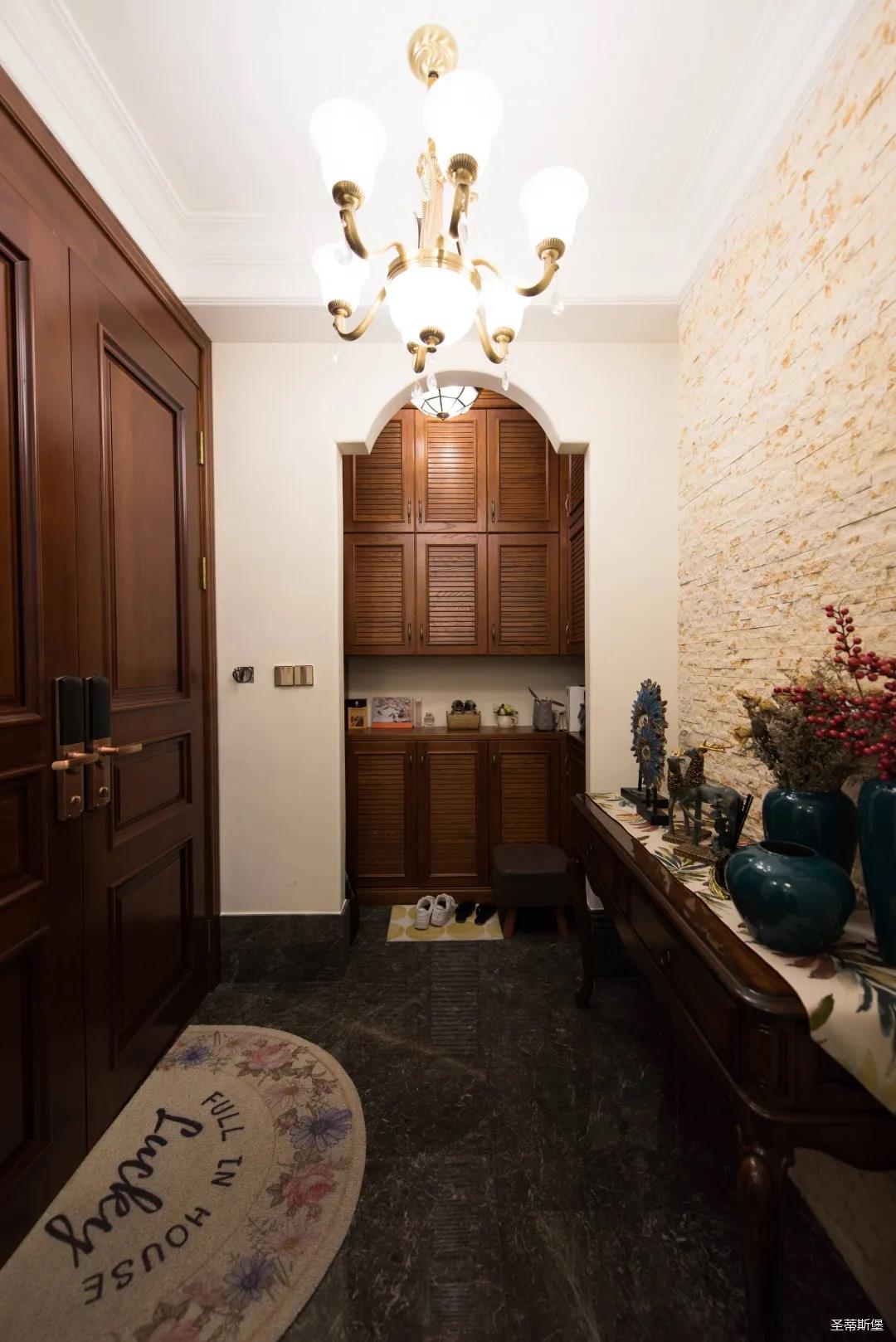 入户玄关双开门设计,仪式感满满!地面定制的瓷砖贴花设计,典雅又大方。核桃实木玄关桌,加上精致的摆件,经典美式复古吊灯,不着痕迹的展现出居者对生活的激情,魅力吸睛,从入户开始感受古典氛围。