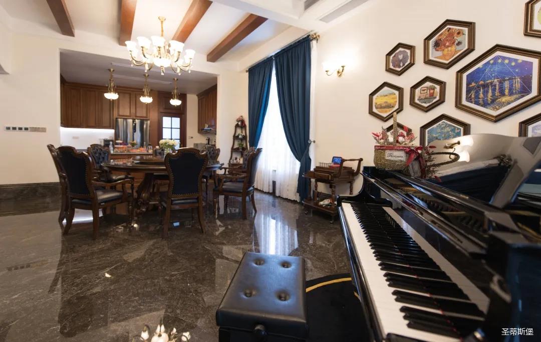 餐厅视线末端是一架钢琴,与窗外景色相结合,扩大了视野,制造出移步易景的生活体验。