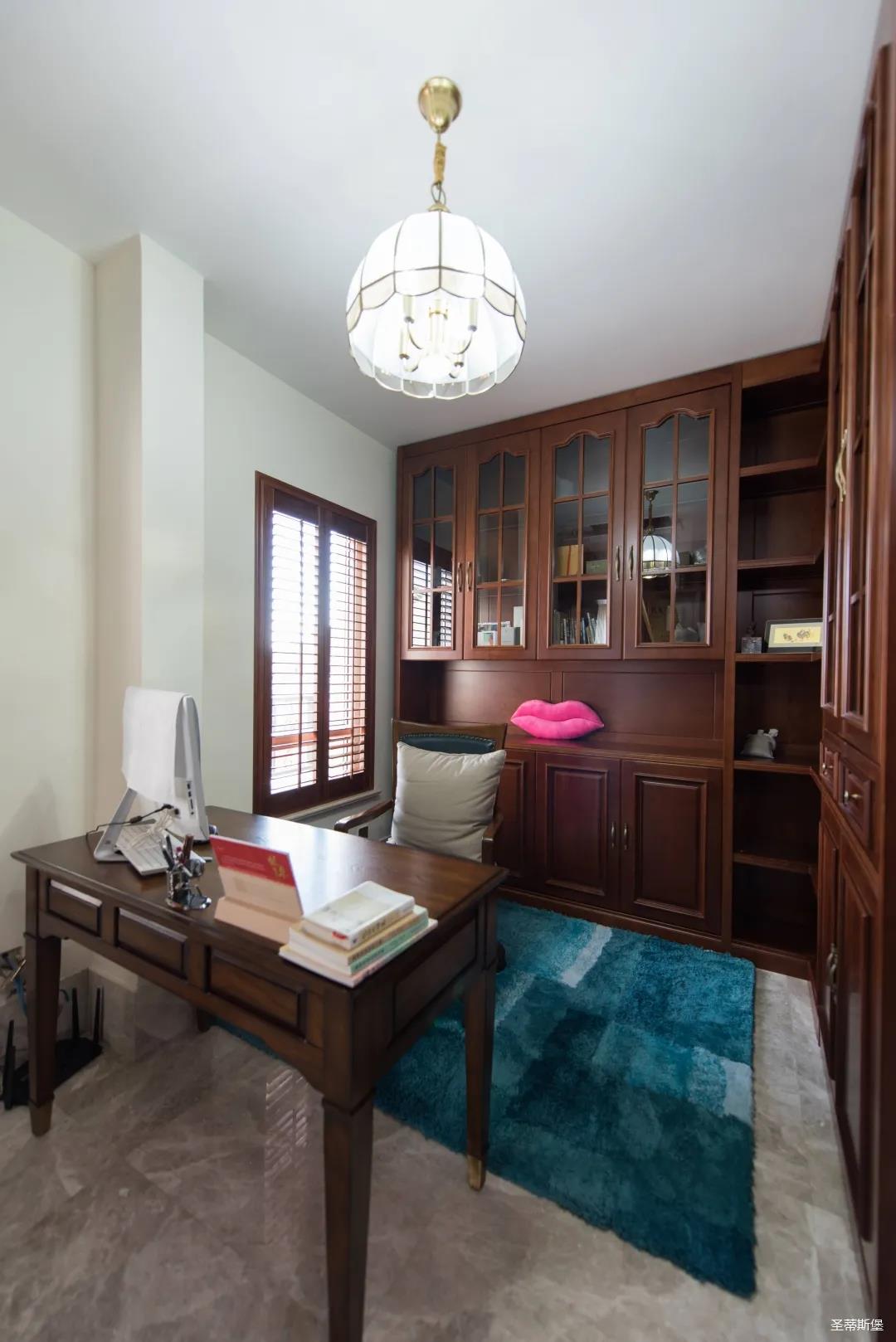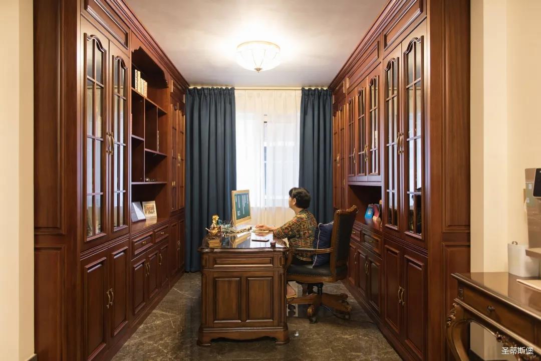 业主夫妇非常热情好客,平时工作之余也会在家里邀三两好友一起观影,观影室的整体设计容纳着浓烈的古色古香,长方形图案排列搭配复古的家具与配饰,精细的雕花艺术,于细节之间演绎着精致生活。不管时光如何辗转变换,家的定义从不曾改变,它抚慰着我们的心灵,承载着我们的喜乐,从细腻的质感中感知家的点滴变化,才是对生活最真实的写照。