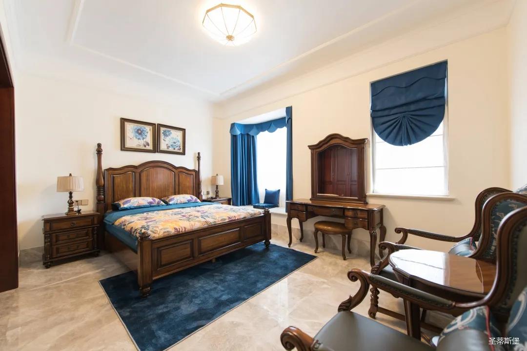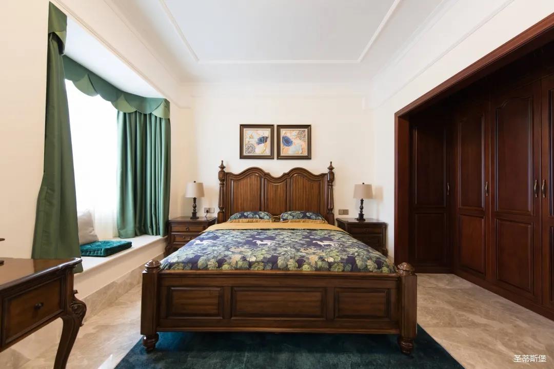三楼是两间卧房,每一间卧室都有自己的特定属性。主人房端庄优雅,雍容尽显;墙面以简洁的美式石膏线修饰,波浪形的实木床屏上点缀着太阳形状的手工雕花,宛如海平面上刚出升的太阳,让整个空间色彩奔放。