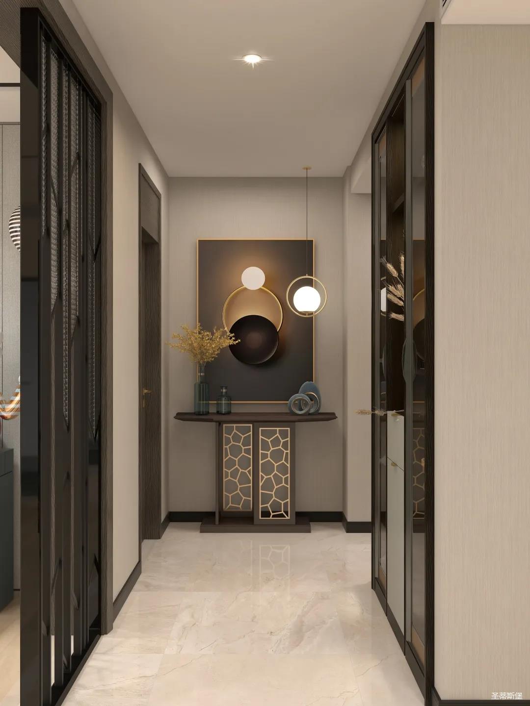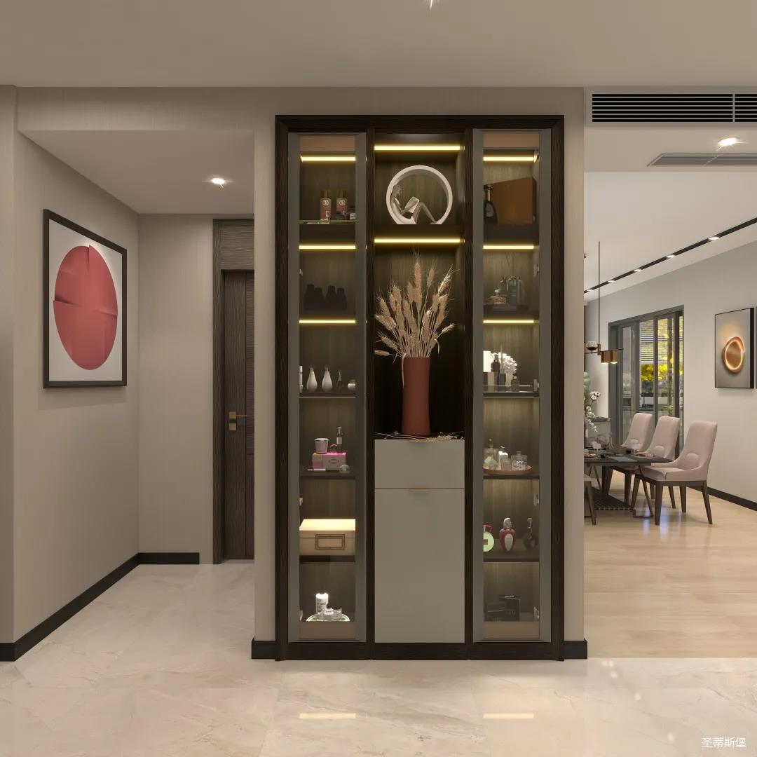 玄关表达的不仅仅是艺术精致,更多是业主气质的独有印记。一迈入空间,便能找到家的归属感。玄关定制柜将最纯粹的色调融入空间,高级浅灰色系加入淡淡的金属材质,提升家的温馨感,高级感。入门处可视储物区与隐秘区域完美划分,既做到了完美收纳又点缀着空间时尚。