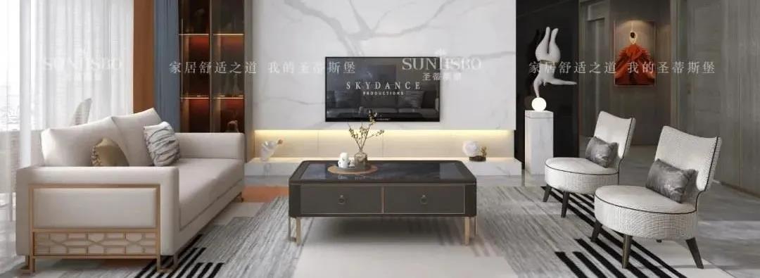 ▲客厅以灰色为主调,电视背景墙采用拼接大理石搭配实木阑珊,与对立墙面形成撞色处理,既可以加深空间层次感,也提升了空间明亮度。一字型真皮沙发与实木电视柜中和了大空间的空旷,打造出一个谈心叙话的和谐空间。